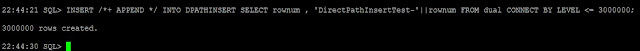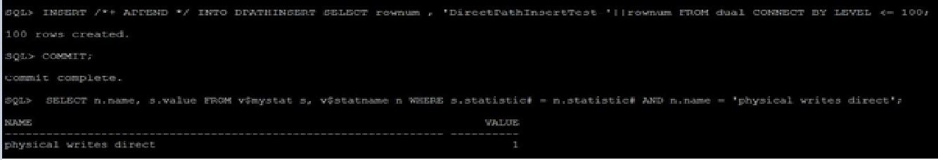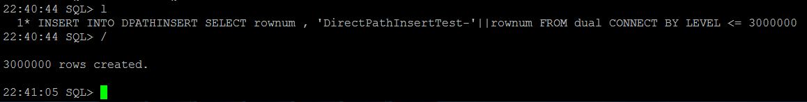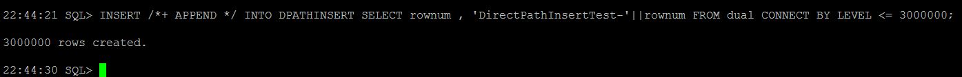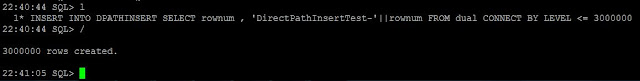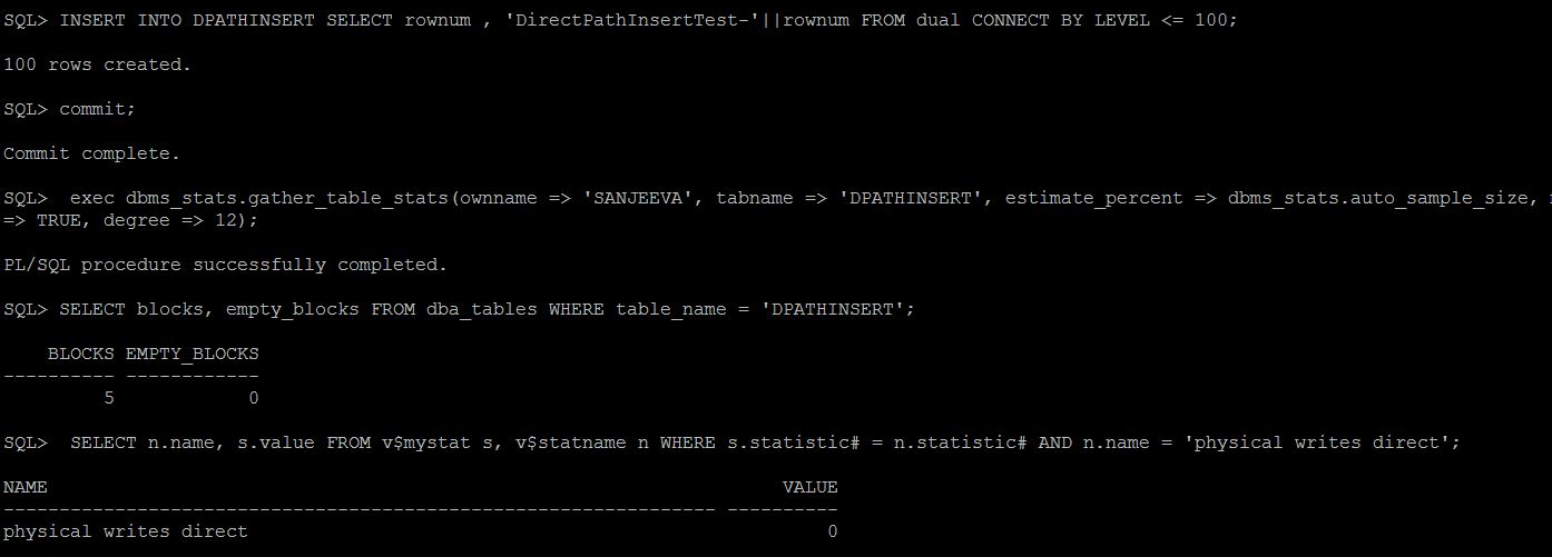 While with Direct path insert, the time was nearly constant and found to be 9 seconds which was a substantial improvement over 21 Seconds of conventional insert time.