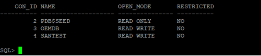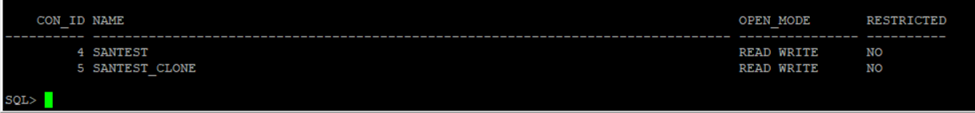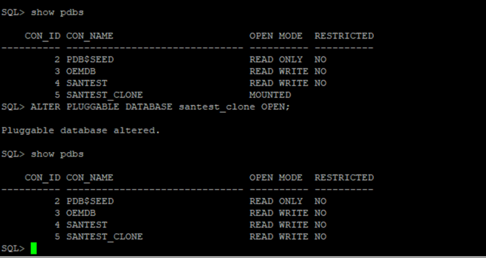 ALTER PLUGGABLE DATABASE santest_clone OPEN;
