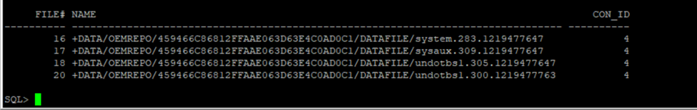 FILE_NAME_CONVERT maps source ASM file paths to target ASM paths within the same or a different disk group. If the disk group names or directory paths are not specified correctly, the clone will fail or place files in an unexpected ASM location. We verify the source datafile paths before running the clone: